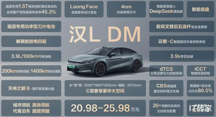 比亚迪还发布了第五代DM-p技术,该技术采用首创的全速域轮端解耦技术,油耗降低0.5~0.8L/100km。汉L EV车型提供单电机和双电机两种动力,单电机板搭载最大功率500kW 后驱电机,该电机为首个转速为30511rpm量产电机;双电机搭载最大功率230kW和580kW前后双电机,最大续航为701公里,零百加速最快仅需2.7s。汉L DM车型搭载最大功率115kW 1.5T插混发动机,匹配最大功率200kW 后驱单电机或功率均为200kW 前后双电机,纯电续航200公里,零百加速最快为3.9s,NEDC馈电油耗最低为3.9L/100km,综合续航可达1400km。