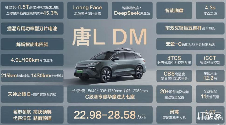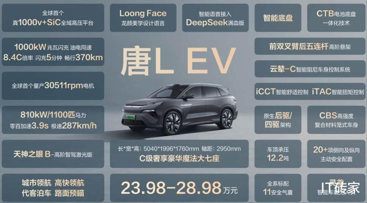 唐L EV车型同样采用最新的超级e平台,和汉L EV一样,支持兆瓦闪充,采用原生后驱/四驱架构;DM 车型搭载与汉L DM采用同样的技术和配置,增加了无人机版本车型。内饰部分与汉L 相似,搭载DiLink智慧座舱系统。唐L 采用2+3+2的7座布局,座椅加热、通风、按摩同样安排到位,第二排座椅可以完全放平。新车动力配置与汉L 保持一致,不过因为风阻和重量不同,唐L EV车型零百加速最快为3.6秒。唐L DM车型耗亏电油耗为5.6L/100km,综合续航可达1270公里。