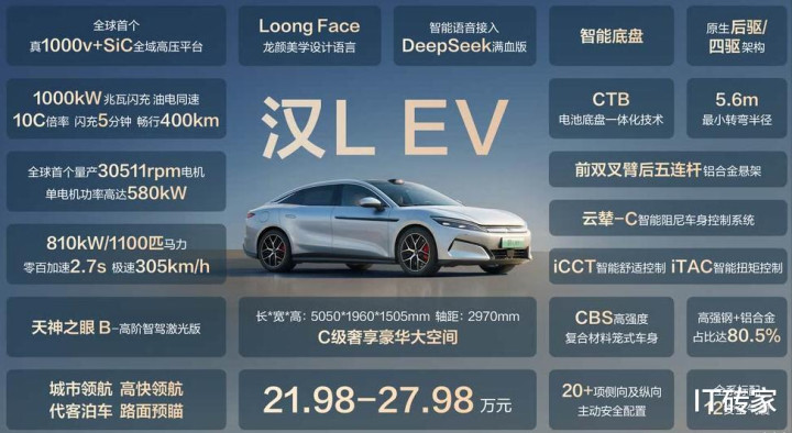 比亚迪王朝网旗下重磅车型汉L和唐L在4月9日迎来正式上市。汉L 推出了纯电和插混两种动力,其中,纯电动力的汉L EV共推出三款车型,售价为21.98-27.98万元;插混动力的汉L DM推出三款车型,售价为20.98-25.98万元。汉L 不仅是王朝网的旗舰车型,外观采用最新的龙颜设计,更是搭载比亚迪旗舰技术。